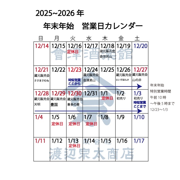 2025年12月も残すところあとわずか 會津酒楽館は12月16日の定休日を最後に そこからは年末まで休みなく営業いたします。 営業時間は以下の通りです。 12月23日(火)短縮営業日(10:00~17:00) 12月24日(水)短縮営業日(10:00~17:00...