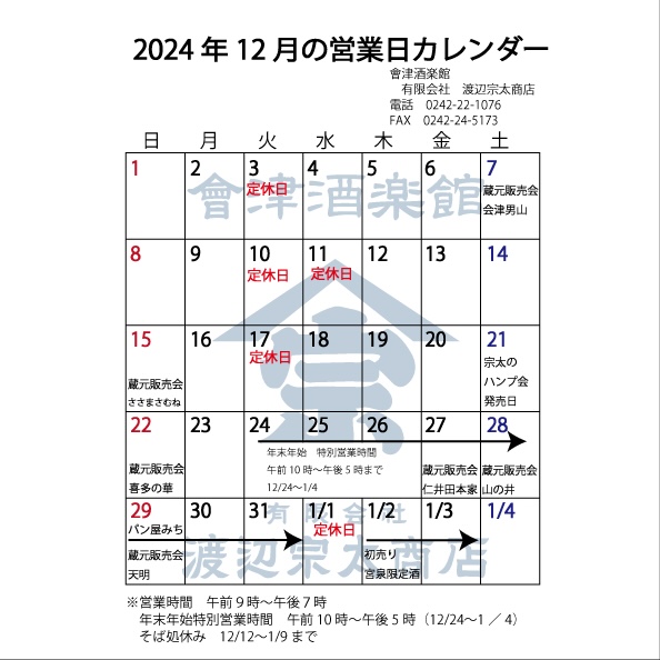 2024年12月 2025年1月の定休日は